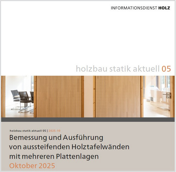 In der im Oktober 2025 erschienenen Broschüre „Bemessung und Ausführung von aussteifenden Holztafelwänden mit mehrere Plattenlagen“ wird eine Berechnungsmethode für Holztafelwände mit mehreren Plattenlagen (Beplankung + Bekleidung) vorgestellt. Die Methode ergänzt den Nachweis für endverankerte Holztafelwände nach Eurocode 5 und kann als „genauerer Nachweis“ angewendet werden. Zusätzlich zur Berechnungsmethode werden die Anforderungen an Konstruktion und Ausführung von aussteifenden Holztafelwänden zusammengestellt. Ergänzt wird die Broschüre mit digitalen Anhängen zur Berechnung und Konstruktion.