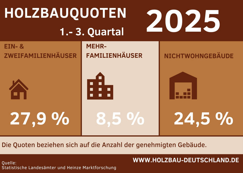 Die Zahlen bei den Nichtwohngebäuden in Holzbauweise sind noch nicht wieder auf dem Niveau des Vorjahres. Die absoluten Genehmigungszahlen vom 1. bis 3. Quartal 2025 in diesem Sektor lagen bei 3.861 genehmigten. Damit liegen sie noch leicht unter den Vorjahreszeitraum. Aber die Nachfrage zieht wieder an.